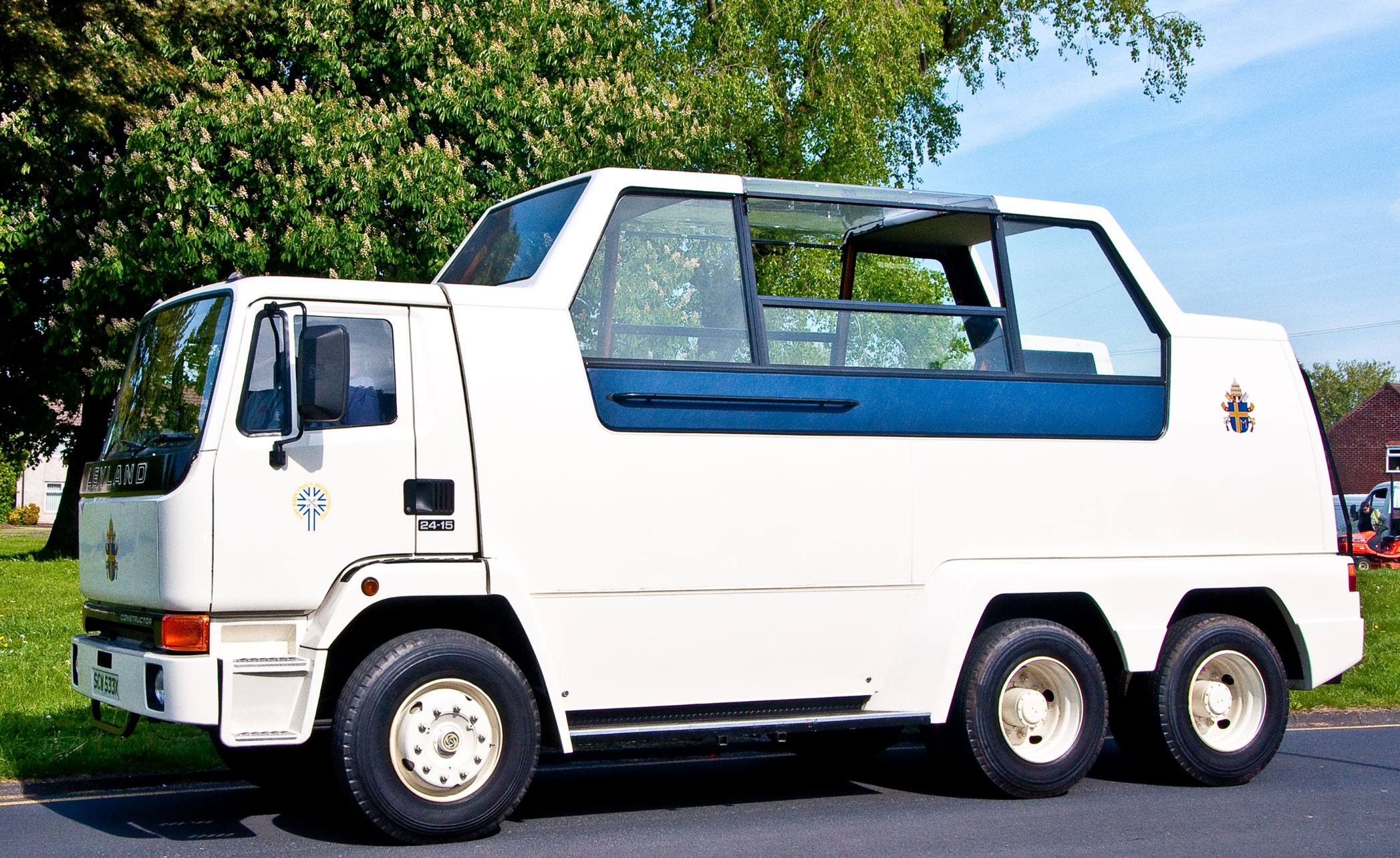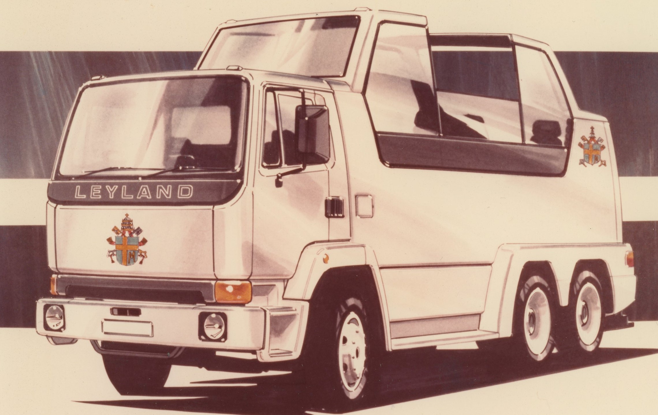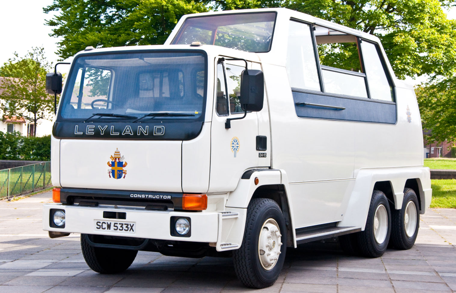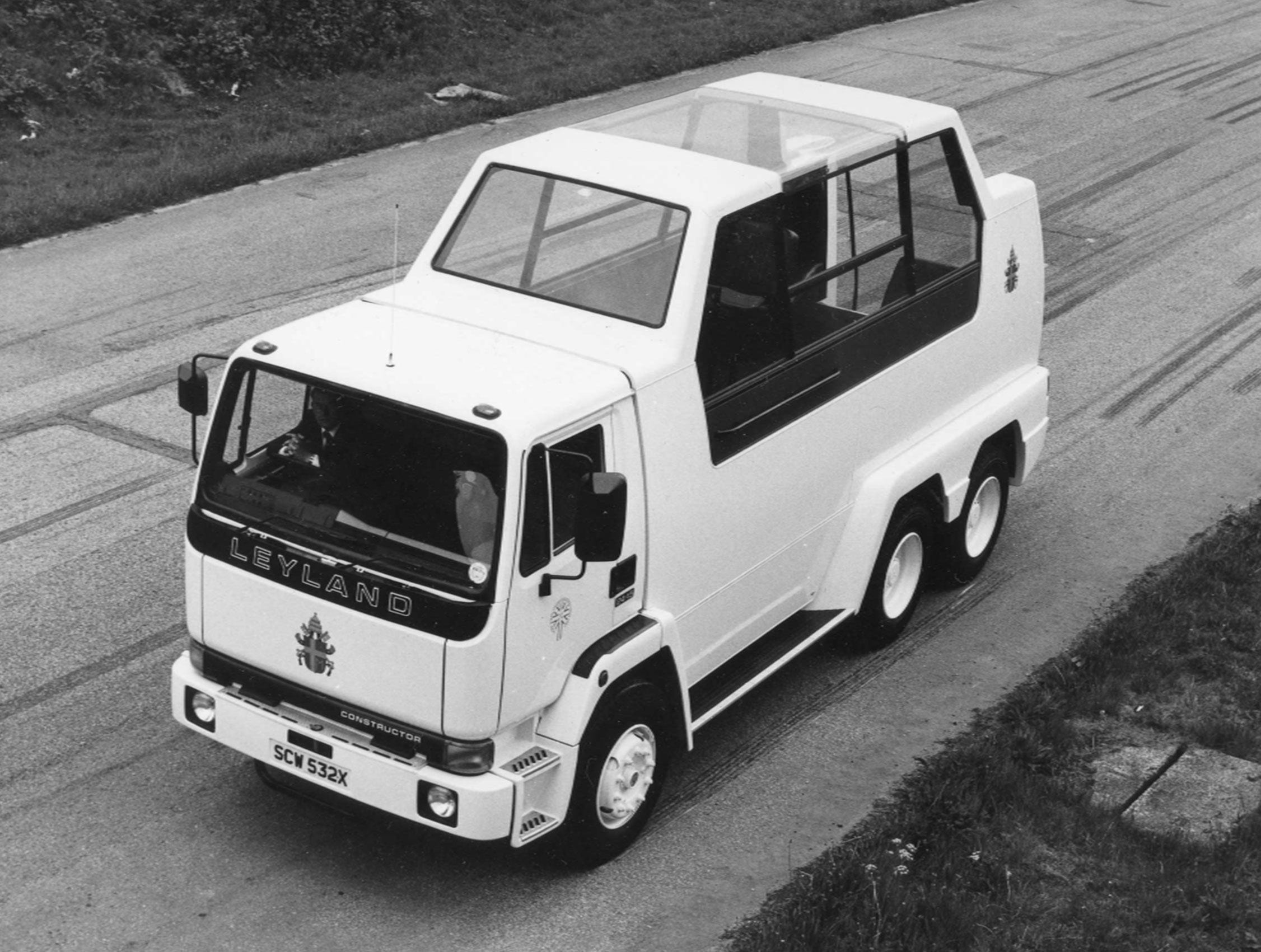 Leyland supplied a truck-based popemobile in 1982 for Pope John Paul II’s visit to the UK. A high platform ensured visibility of the Pope in large crowds. To protect the Pontiff, the custom chassis was built to provide rapid acceleration and off-road capability in the event of an emergency, and bullet proof glass and under floor armour was installed.