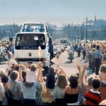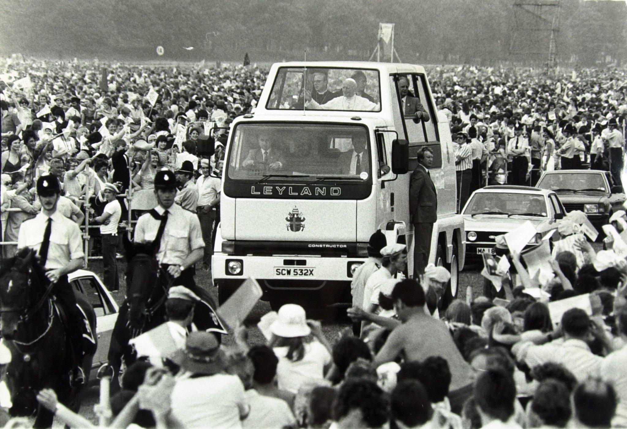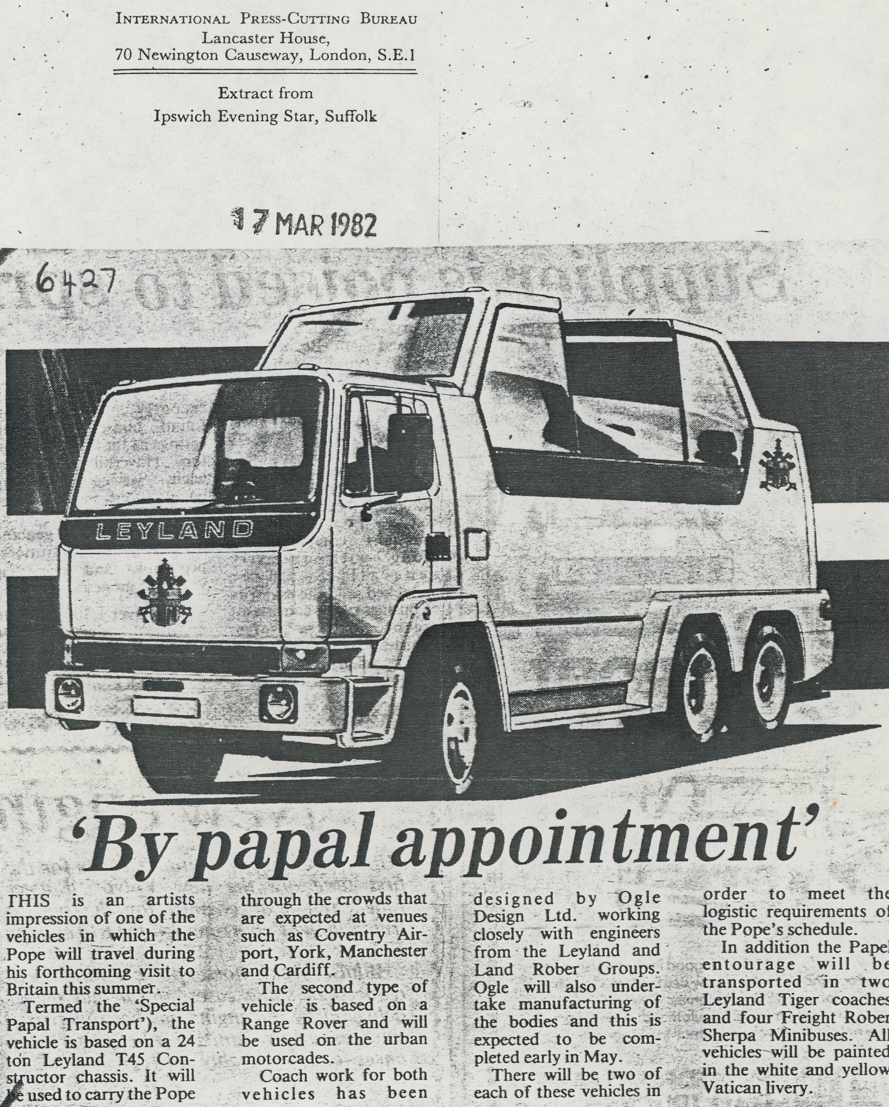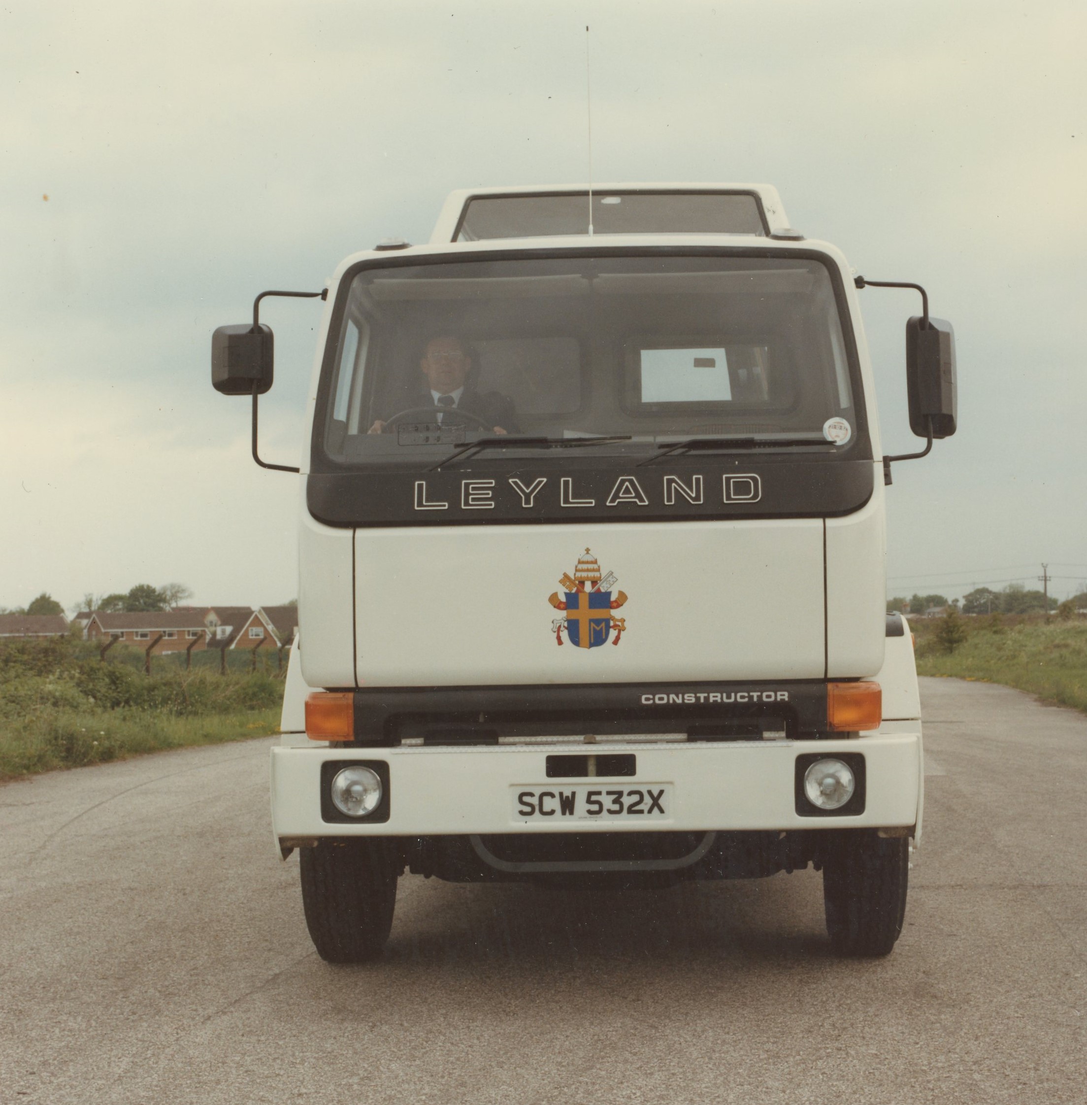 Leyland supplied a truck-based popemobile in 1982 for Pope John Paul II’s visit to the UK. A high platform ensured visibility of the Pope in large crowds. To protect the Pontiff, the custom chassis was built to provide rapid acceleration and off-road capability in the event of an emergency, and bullet proof glass and under floor armour was installed.
